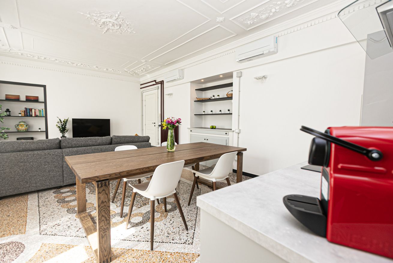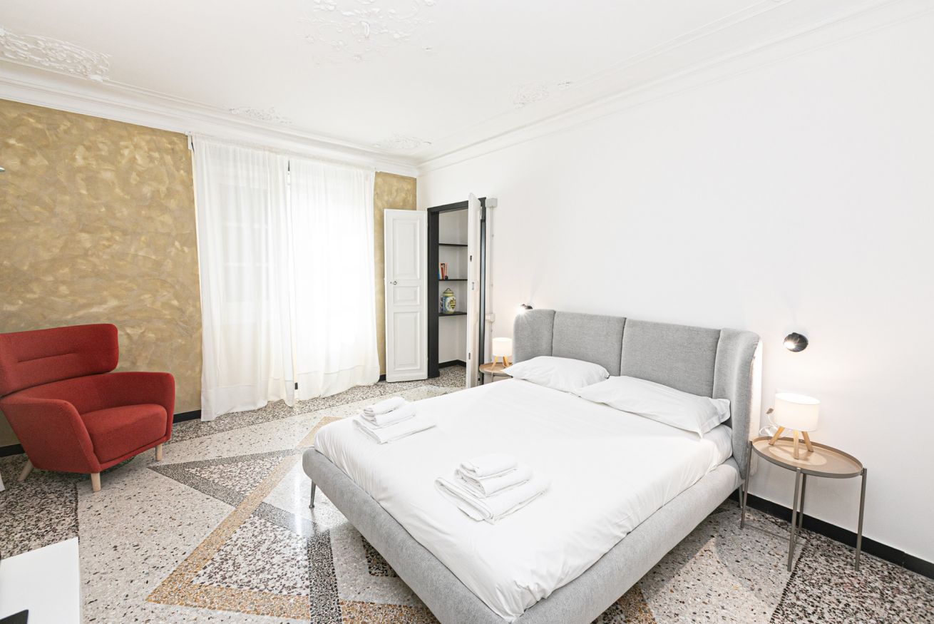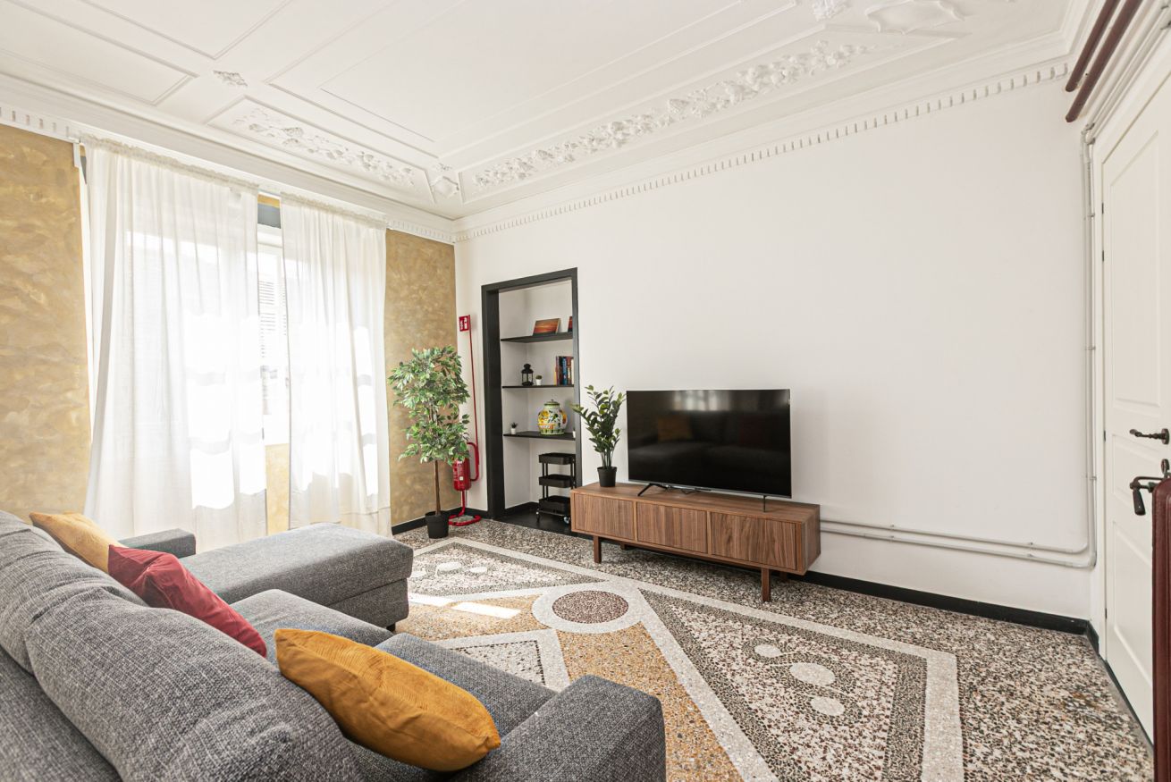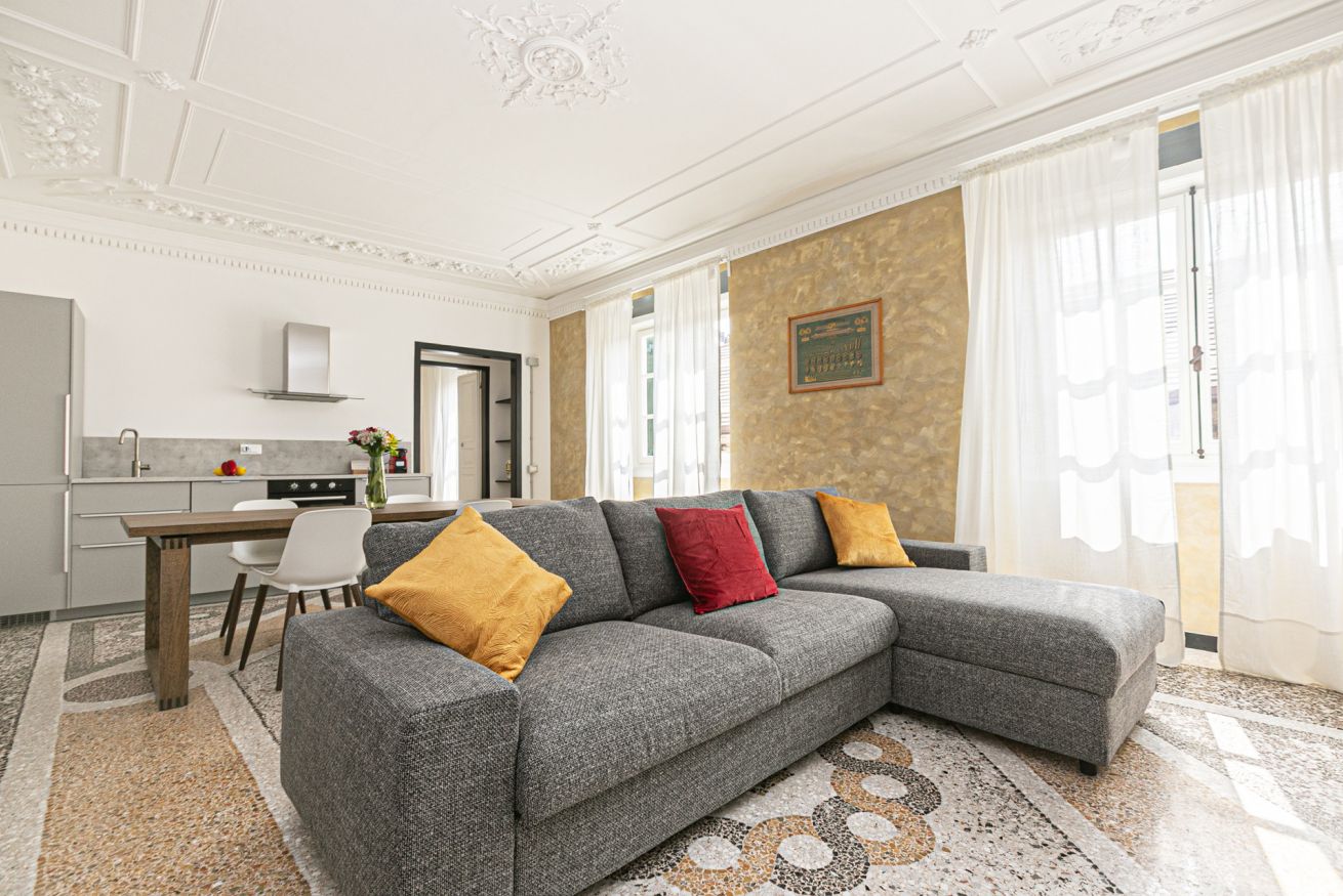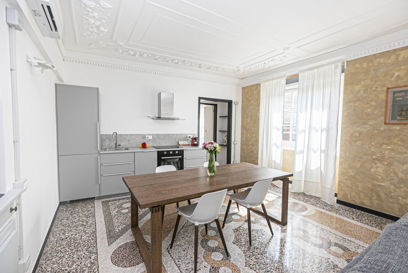 L'appartamento è caratterizzato da molti dettagli d'epoca. I soffitti sono decorati da meravigliosi stucchi e i pavimenti del salone e della camera sono costituiti da splendidi pavimenti in graniglia alla genovese. Si trova a pochi passi dall'Acquario di Genova, dal Porto Antico, dalla Cattedrale di San Lorenzo e dai principali luoghi di interesse della città.
