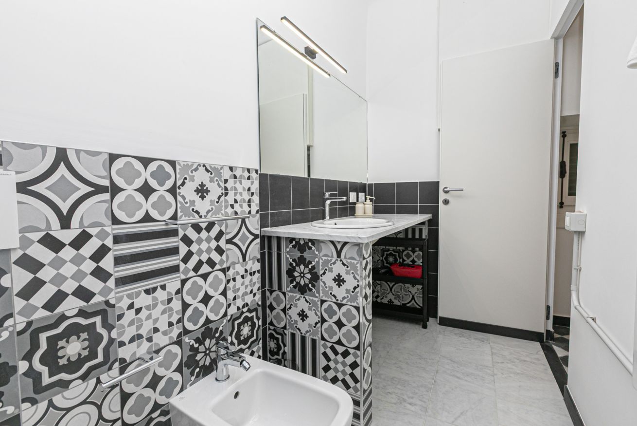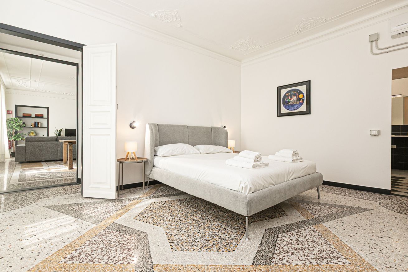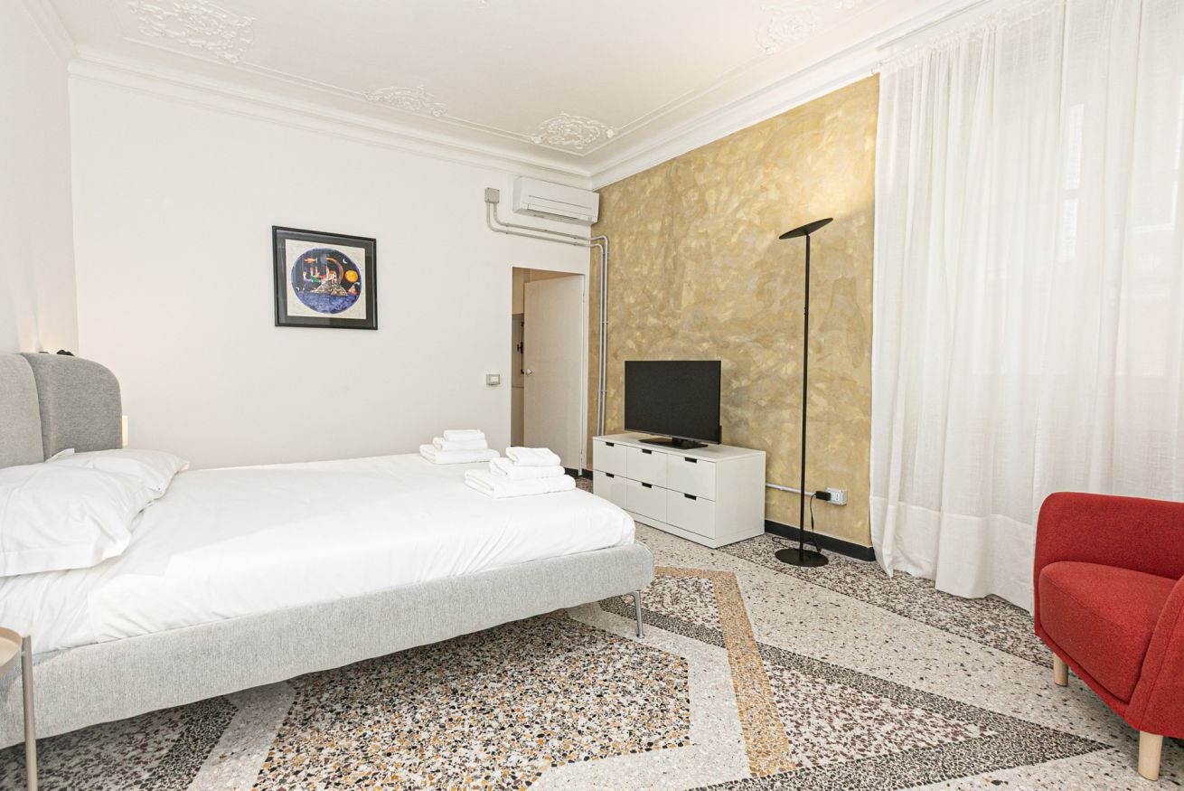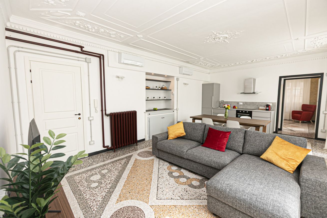 L'appartamento è caratterizzato da molti dettagli d'epoca. I soffitti sono decorati da meravigliosi stucchi e i pavimenti del salone e della camera sono costituiti da splendidi pavimenti in graniglia alla genovese. Si trova a pochi passi dall'Acquario di Genova, dal Porto Antico, dalla Cattedrale di San Lorenzo e dai principali luoghi di interesse della città.