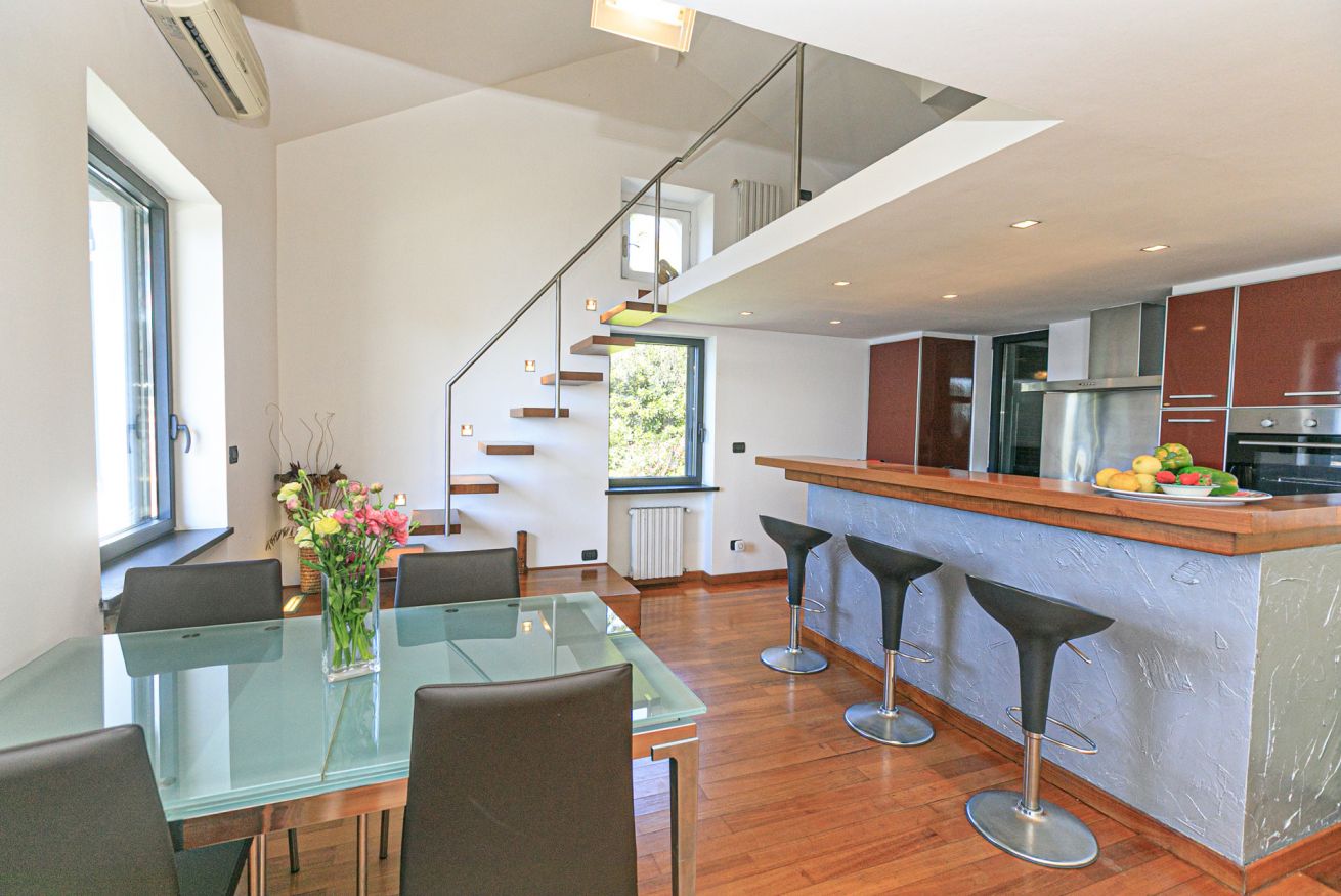 Si sviluppa su due livelli, collegati da una bellissima scala in legno fatta su misura, che ricorda la scala di una barca, ed è composto al primo livello da: